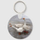 Foto de Zolotareva. Blanco ganso en la nieve blanca. Los geeses son graciosos.