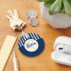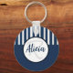 Simple, classic, and stylish, this keychain features vertical, navy blue and white stripes, with a wide, blue color block at the bottom. A round badge holds your name and monogram. Great stocking stuffer!