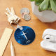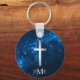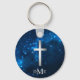 Esta cadena de teclas única presenta una cruz cristiana plateada contra un fondo azul bonito con pequeñas estrellas. Su monograma de tres letras está en plata en la parte inferior. La parte posterior tiene el mismo fondo azul estrellado y plateado y dos campos de texto personalizado.