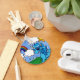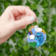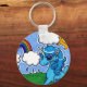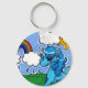 Un llavero con un ilustracion tradicional de una Unicornio alegre azul brillante con una oreja perforada y una estrella en la mejilla parados al lado de un arco iris.