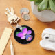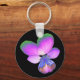 Este llavero muestra una fotografía de una flor Pansy salvaje. La foto ha sido pintada artificialmente, lo que ha resultado en una marsopa con pétalos rosados brillantes de color violeta con puntas verdes de pétalos y un centro azul profundo. El fondo es negro para hacer que la flor destaque.