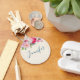 Cadena de teclas personalizada con un borde rosa rosado y flor de peones. Alegre y veraniego. El fondo es una imagen falsa de pergamino.