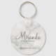 Añada un toque personal a su boda con la cadena de claves personalizada de la dama de honor. Esta cadena de claves presenta el nombre personalizado de la dama de honor en el estilo de letra de escritura moderno gris con título y fecha boda en el estilo de fuente sans serif moderno gris sobre fondo de mármol blanco. También perfecto para la criada de honor, madre de la novia y más. Los detalles de mármol se simulan en las obras de arte. Este producto no será fabricado con mármol real.