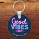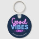 La cadena de teclas Personalizados de moda sólo para neones Rótulo divertido. Diseño divertido y positivo con un cartel de neón con el lema "Sólo buenas vibraciones". Muy retro de los años 80. El texto de abajo es personalizable. Borra el texto si no desea una versión personalizada.