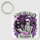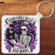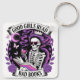 Un diseño colorido y vibrante muestra a una esqueleto femenina leyendo un libro mientras toma un cóctel al vapor. A su alrededor hay flores moradas y mariposas, que se suman a la estética animada. El texto audaz y colorido dice: "Los buenos chicas leen libros malos". Este diseño único está disponible en una amplia gama de productos.