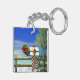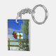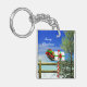 Cadena de claves con mi diseño original de un buzón de correo festivo decorado para Navidades con cintas rojas y verdes, lleno de regalos de Navidades envueltos de colores. El texto dice "Feliz Navidad".