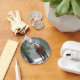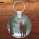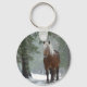 Un llavero con una fotografía de un caballo marrón con una larga melena blanca. En un bosque con copos de nieve cayendo por todos lados.