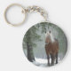 Un llavero con una fotografía de un caballo marrón con una larga melena blanca. En un bosque con copos de nieve cayendo por todos lados.