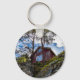 Pequeña casita de campo roja sobre un acantilado con un bello entorno. Fotografía.