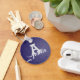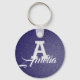 Es una cadena de claves azules con un nombre personalizado y un monograma de color blanco