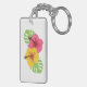 Lleva los trópicos con esta cadena de claves. Flor de hibisco amarillo y rosa colocada en un lado con hojas verdes detrás. El otro lado tiene las palabras Aloha en una fuente con estampado rosa y blanco.