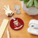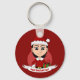 Keychain con un ilustracion de un lindo chica sonriente feliz con el pelo negro corto, lleva disfraz rojo y blanco de Santa Claus y tiene un regalo; con plantilla de texto editable para tu nombre o mensaje, Navidades diseño de vacaciones con fondo rojo