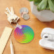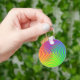 Aquí hay una colorida cadena de claves con un patrón de arco iris espiral abstracto girando alrededor de un objetivo central en colores verdes, azules, amarillos, naranjas y rojos.