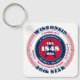 La cadena Wisconsin State Keychain tiene un diseño de tipografía circular con colores rojo, blanco y azul sobre un fondo blanco. El texto incluye el nombre del estado, la capital, la abreviatura del estado, el nombre del residente, la región, la zona horaria, las coordenadas geográficas, el año de su condición de estado, y el país - Estados Unidos de América. Una idea única de regalo patriótico.