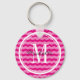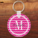 Cadena personalizada de llavero de patrón de chevron rosa neón con lineas lindas de zag zig. Cadena de llaves monogramada para mujeres y chicas adolescentes. Diseño de zigzag preppy con letra inicial con nombre de monograma y tipografía de escritura elegante. Un favor o una idea de regalo de cumpleaños. Color del fondo del personalizable.