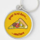 Ilustracion personalizado de rodajas de pizza con fondo amarillo. Dos campos de texto personalizado en círculo.
