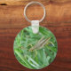Esta brillante cadena de teclas muestra una detallada foto macro de un pequeño saltamontes verde con marcas estampadas marrones sentadas en el pasto. En la fotografía se puede ver el detalle de las patas unidas, antenas largas y ojos negros y dorados del saltamontes.