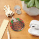 Un feliz gato de los tortoiscones (¡que se parece a un pudín de Navidades!) se sienta en un cojín verde contra un fondo rojo y verde de hojas huecas. El diseño es un personalizable para que usted añada su propio nombre, mensaje e ideas. Dibujo original de Jess Perry con lápiz de color.