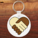 Un hombre negro y un hombre blanco estrechando las manos. Símbolo o logotipo en forma de corazón en la cadena de claves