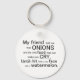 "Mi amigo me dijo que las cebollas son la única comida que te puede hacer llorar. ¡Hasta que lo golpeé en la cara con una sandía!" Esta cadena de claves es personalizable, por lo que puede personalizarla con un nombre o su propio texto, si lo desea.