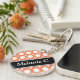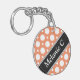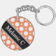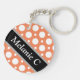 Cadena de teclas acrílicas redondeadas de dos lados con un patrón de puntos polka variado con tamaños alternados de círculos blancos sobre un naranja al estilo de un café. Su nombre o texto personalizado se imprime diagonalmente en blanco sobre una franja negra diagonal desenfocada en ambos lados.