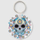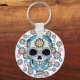 Los tonos azules y rosas del cráneo de azúcar están rodeados de flores y corazones coloridos.