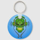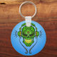 Un elaborado diseño de cráneo de azúcar DJ decorado con complejos remolinos y patrones de puntos. Los audífonos se sientan encima del cráneo con dos cables colgando debajo. Las líneas y los círculos complejos son de color negro sólido, mientras que el interior del cráneo está acabado con un verde intenso y un amarillo vibrante. La música sale por los audífonos en forma de tornillos negros de luz. Una sombra cae sobre el fondo azul brillante haciendo que parezca que el cráneo está sentado justo encima de la superficie de la cadena de claves. Esta imagen inspirada en el Día de los Muertos es una representación colorida de la cultura DJ.