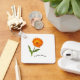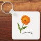 Flor naranja con gotas de lluvia en los pétalos, tallo y hojas verdes. El título "Caléndula" se muestra en texto curvo en la parte inferior.