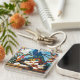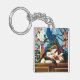 Un gato calico jugando con un dragón chino rojo frente a una vidriera de pavo real.