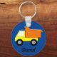 Camión de juguete al estilo personalizado. Cadenas de claves personalizados. Fondo azul. Edite el nombre para hacer que estas cadenas de claves sean personalizadas. Una idea de regalo para los niños.