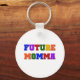 Camisetas, caramelos, tarjetas, pegatinas, botones, bolsos de tote, mousepads y otras prendas de Future Momma con texto de colores primarios.