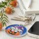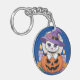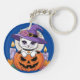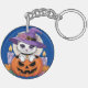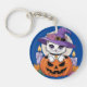 Un gato blanco con un gorra de brujas sentado en una calabaza de Halloween rodeado de velas.