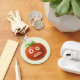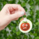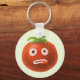 La divertida llavero de tomate con un ilustracion personalizado de un extraño personaje de tomate con la lengua atascada y una mirada desconcertada en los ojos.