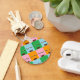 Los monstruos sonrientes bloquean las caras de un patrón colorido.