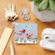 Un ilustracion de una linda pareja de cardenales rojos felices en una rama desnuda, cantando "Feliz Navidad" en la nevada montaña, rodeada de pinos cubiertos de nieve. Este cantante saluda su amor con su dulce música. Inspirémonos a estos Navidades y compartámoslo con su familia y amigos.