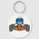 El chico que conduce una carrera se pone kart con una estrella amarilla en el capó y el casco.