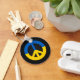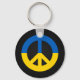 Cadena de teclas redonda con un símbolo de paz en los colores de la bandera ucraniana sobre un fondo negro