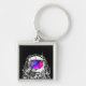 una obra de arte decorativa de un astronauta con su traje espacial, mientras que el casco refleja nebulosas espaciales coloridas en formas surrealistas y en una cadena de llaves.