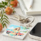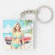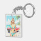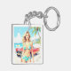 Retrato de un encantador chica en una hermosa playa tropical con sol y mar, y un clásico coche rojo en llamas, que enmarca el luminoso panorama con colores brillantes y brillantes de verano.