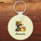 Un llavero con una imagen linda. Una chica con un traje de abeja crochet y una abeja a su lado. Viendo un frasco de miel.