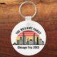 Personalized Chicago Illinois vacation keychain with a silhouette of the city skyline in front of a cool sunset. Cool trip keepsake souvenir for a family trip.