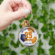Este equipo deportivo colorea la cadena de claves temática del fútbol para niños o chicas y presenta un sencillo gráfico del fútbol —con los paneles típicamente negros azules y naranjas— en el que se puede personalizar fácilmente el nombre y número de camiseta del atleta, más el nombre de la escuela y el nombre de la mascota en colores coordinados - de katz_d_zynes