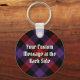 Insignia escudo de Clan Brown rodeada por una correa y hebilla sobre fondo tartán. Texto personalizado en ambos lados.