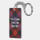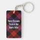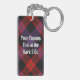 Insignia escudo de Clan Brown rodeada por una correa y hebilla sobre fondo tartán. Texto personalizado en ambos lados.