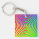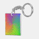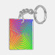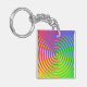 Aquí hay una colorida cadena acrílica con un patrón de arco iris espiral abstracto girando alrededor de un objetivo central en colores verdes, azules, amarillos, naranjas y rojos.