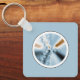 Esta cadena de teclas redonda presenta un arte fractal azul claro en un marco redondo.