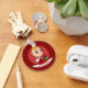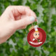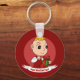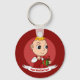 Cadena de claves con el ilustracion de una linda sonriente niña o niño feliz, el bebé está usando ropa roja y blanca y sosteniendo un regalo; con plantilla de texto editable para tu nombre o mensaje, diseño de vacaciones Navidades con fondo rojo