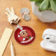 Cadena de claves con el ilustracion de una linda sonriente niña o niño feliz, el bebé está usando ropa roja y blanca y sosteniendo un regalo; con plantilla de texto editable para tu nombre o mensaje, diseño de vacaciones Navidades con fondo rojo