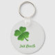 Un trébol verde brillante de cuatro hojas o un shamrock afortunado. Las cuatro hojas del trébol representan fe, esperanza, amor y suerte. En la teoría del color, el verde representa primavera, comienzos, crecimiento y nutrición, buena salud y abundancia. Hay un área de texto personalizable que ahora lee