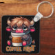 A funny and sarcastic design showcases a cute highland cow holding a to-go coffee cup brimming with coffee. With big blue eyes and a sleepy, tired expression, the cow rests its head on the cup's lid, its fluffy black fur adding to the charm. The colorful text reads, "Coffee first." This playful design is available on a wide variety of products, making perfect gifts for coffee lovers.